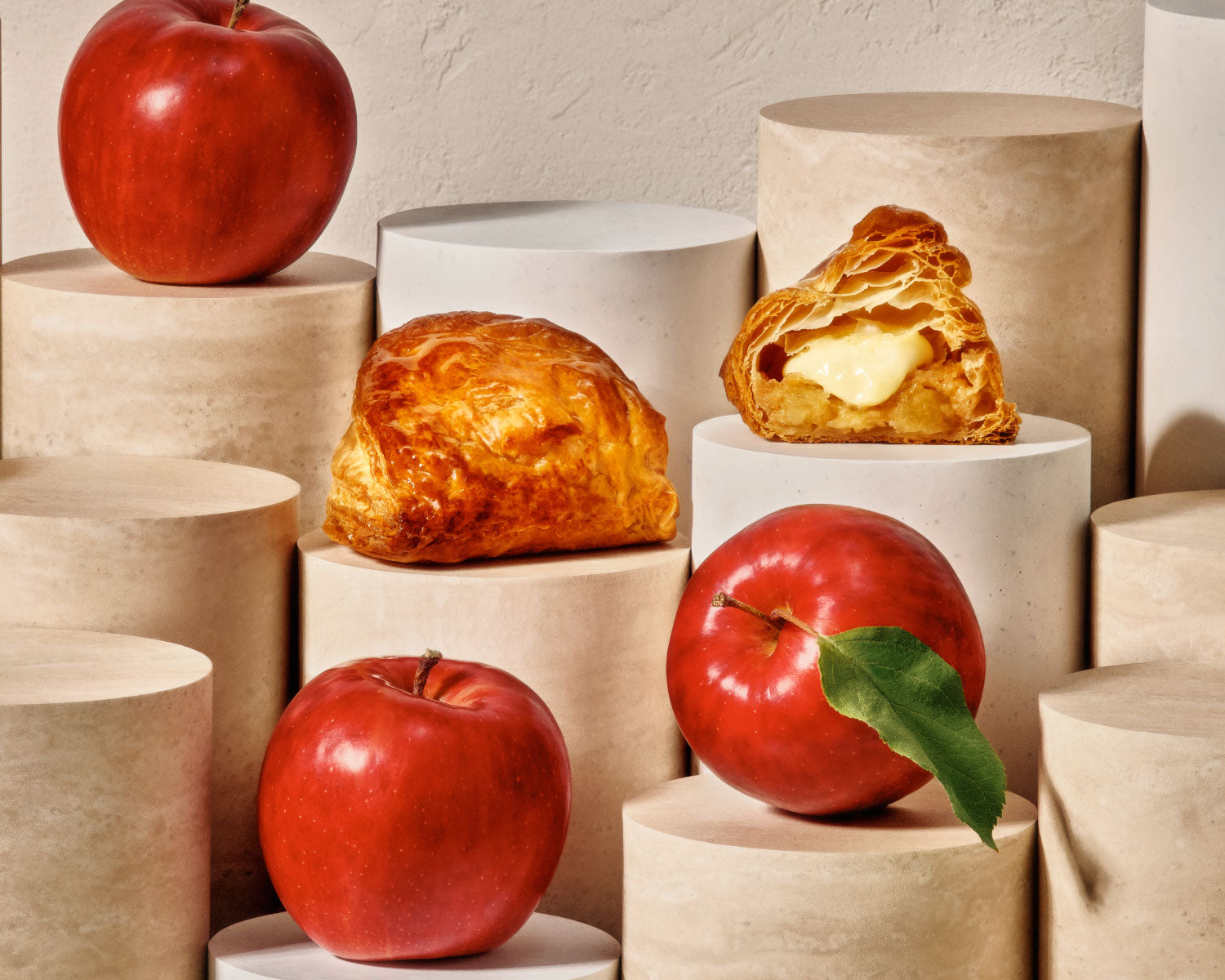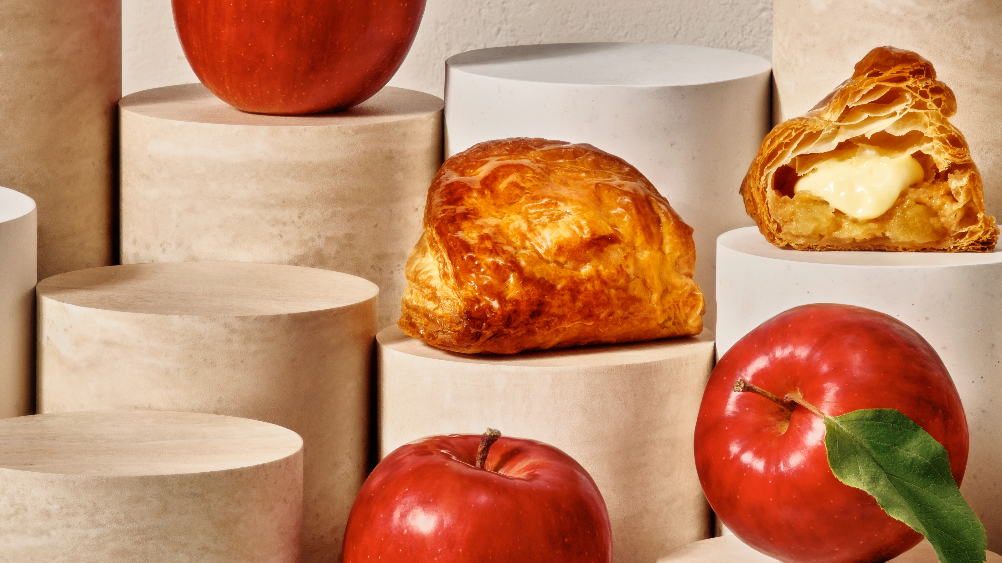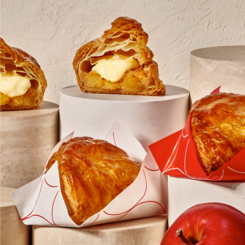 中に入っているリンゴは、フレッシュなタイミングで加工し、大きなキューブ型にすることでゴロッとした食感とリンゴの甘味・香りを楽しめるようにしました。食感を残しながらもパイのサクサク感を邪魔しません。