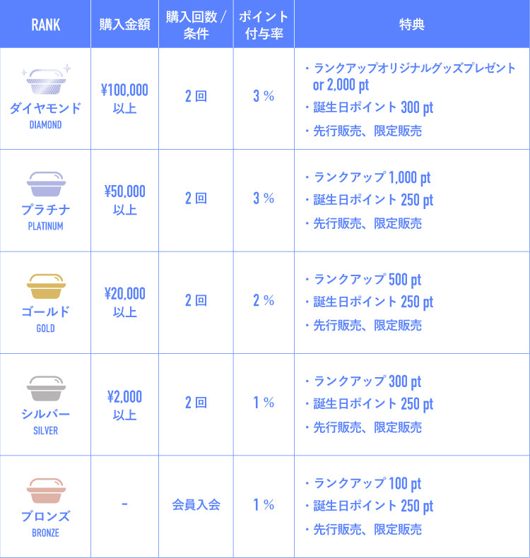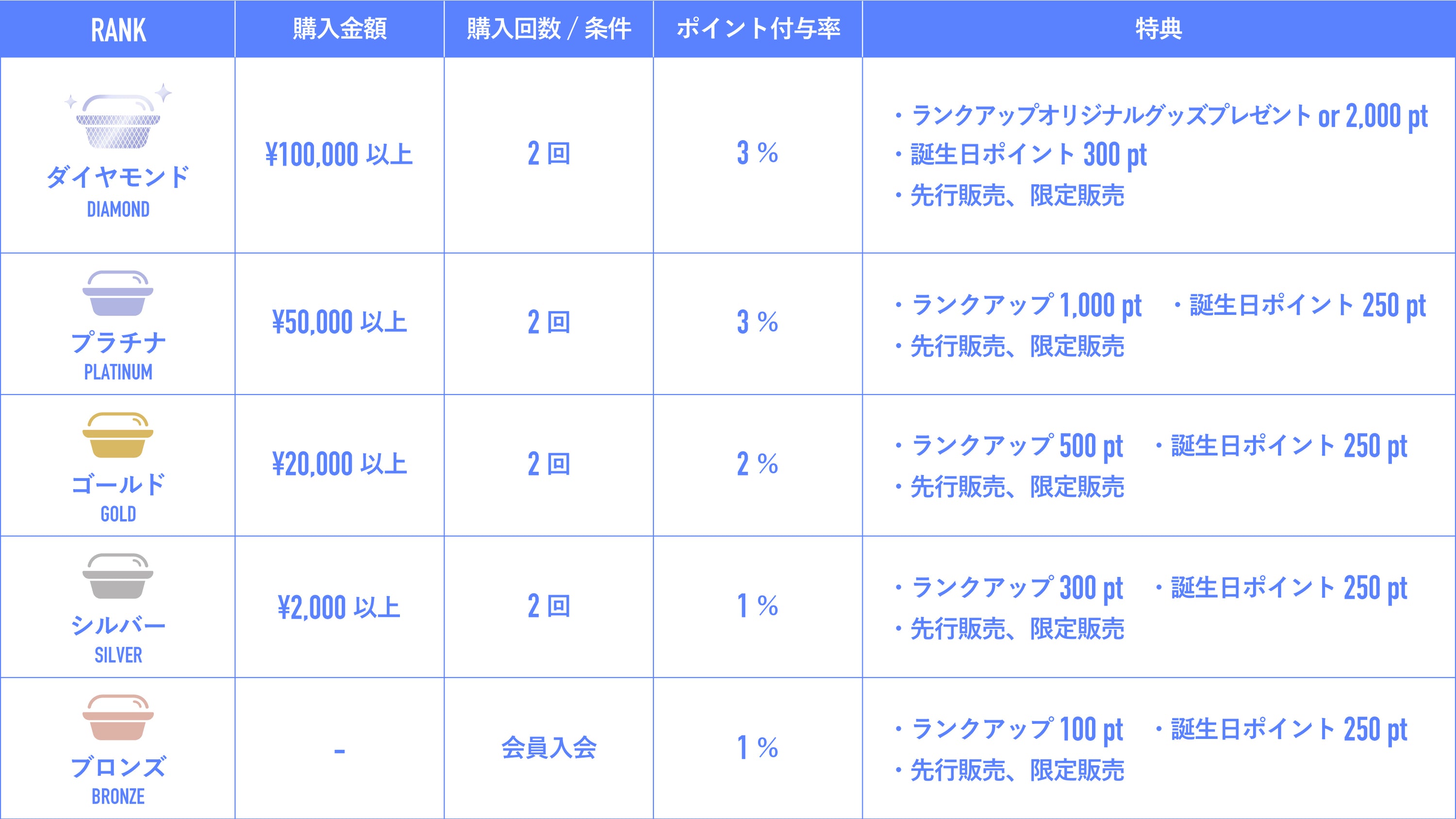 ・年度(12月1日~11月30日の1年間)の購入金額および購入回数に応じて会員ランクが決まります