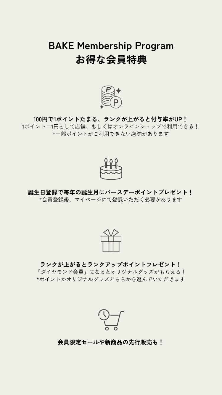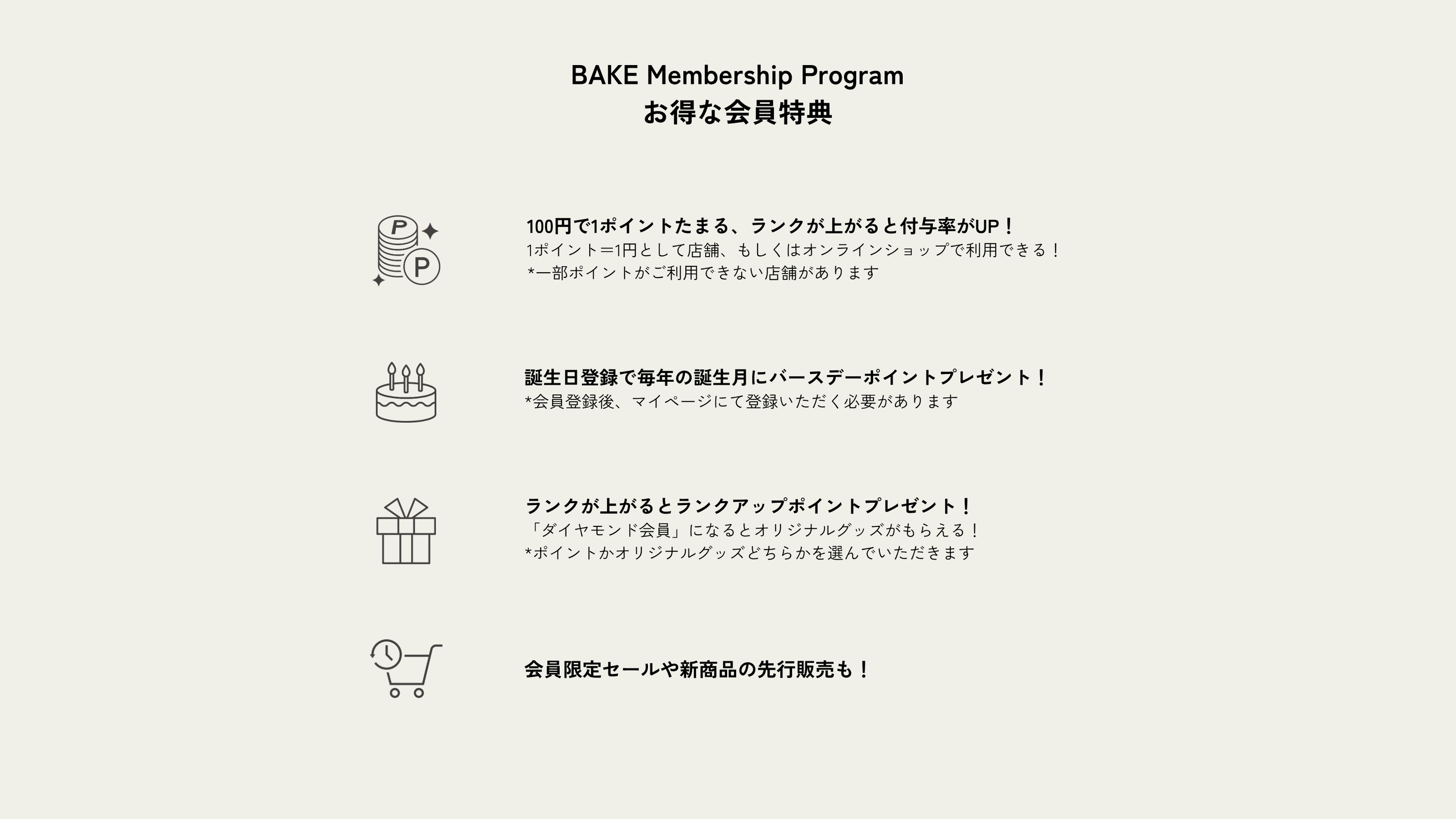 BAKE the ONLINEで購入された商品や、BAKE INC.の店舗(一部店舗除く※①)で購入された商品は、 BAKEのポイント付与対象となりポイントをご利用できます。