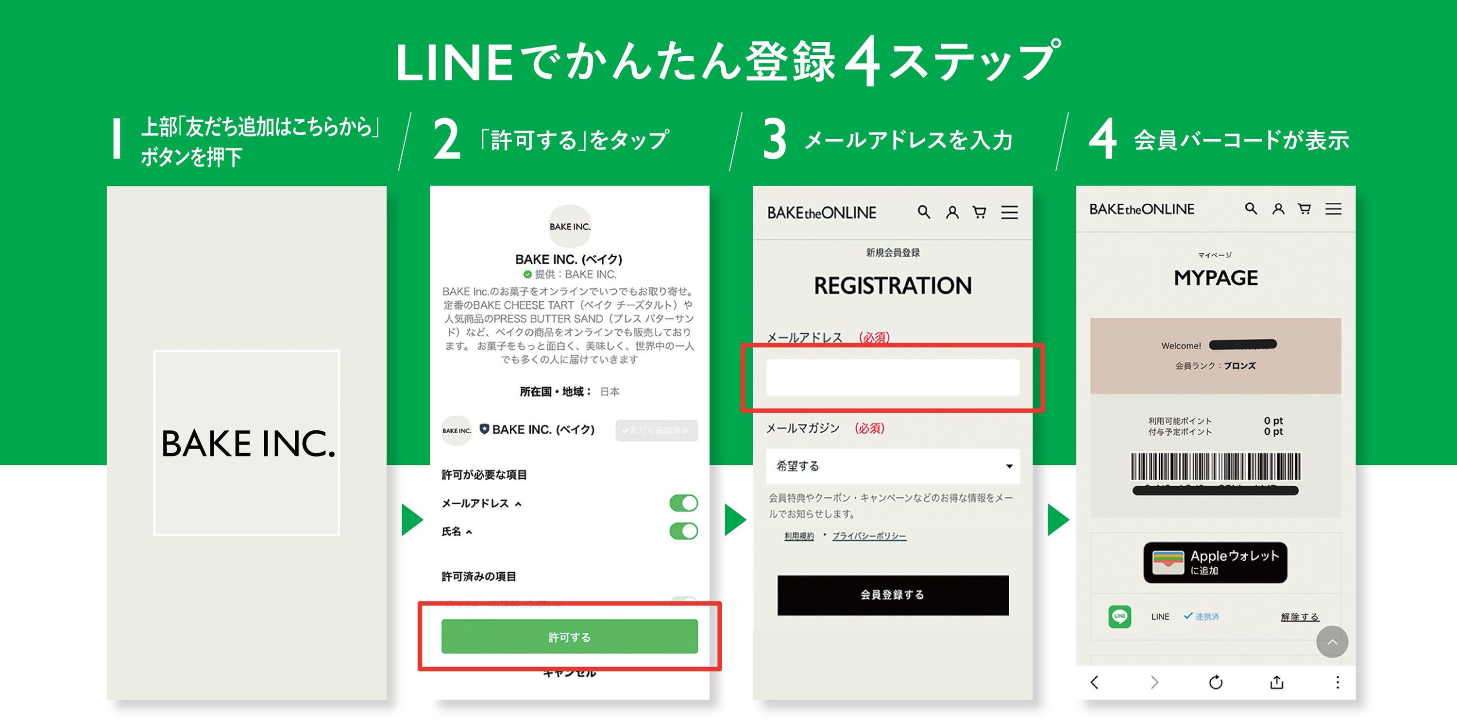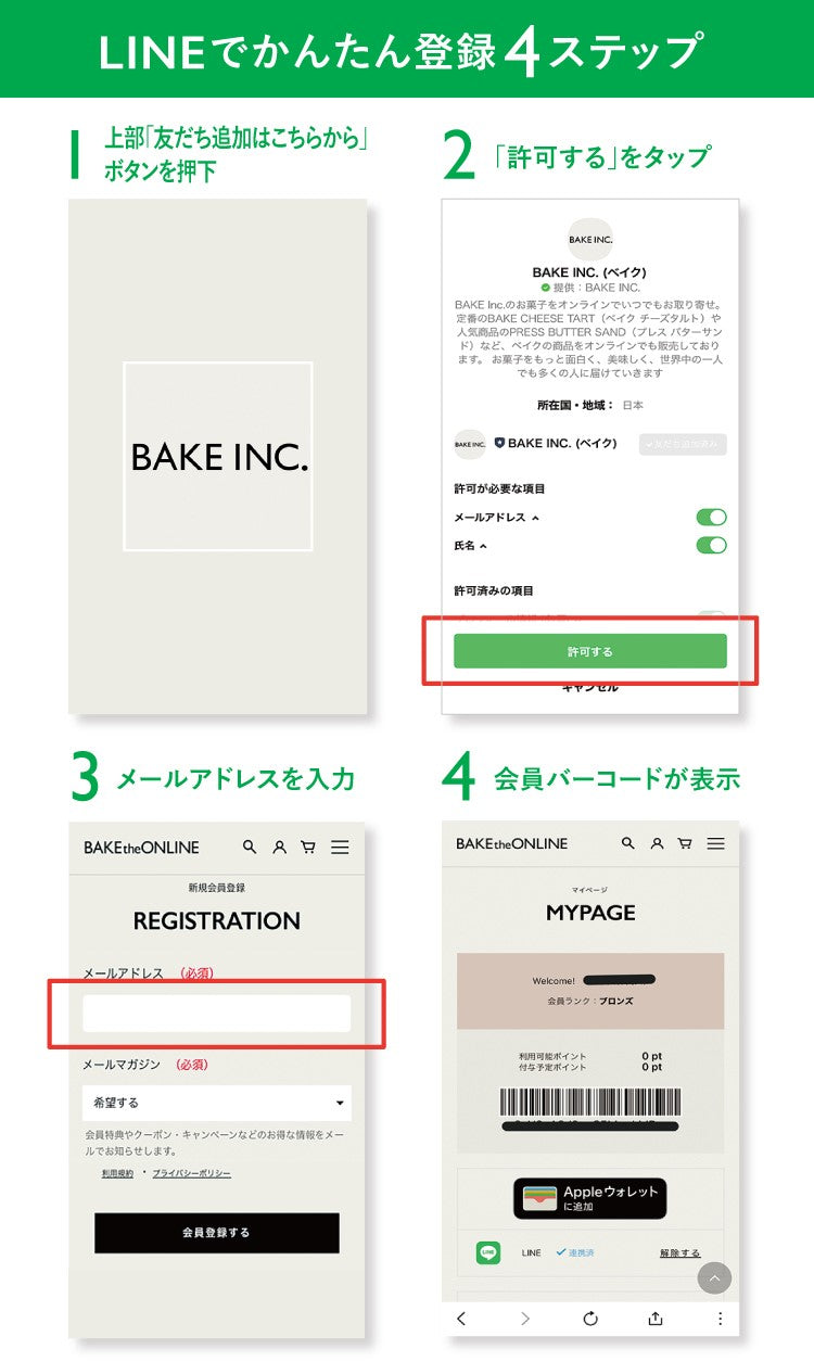 ※誠に恐れ入りますが、BAKE INC.公式アプリや検索アプリからはウォレット追加ができません。